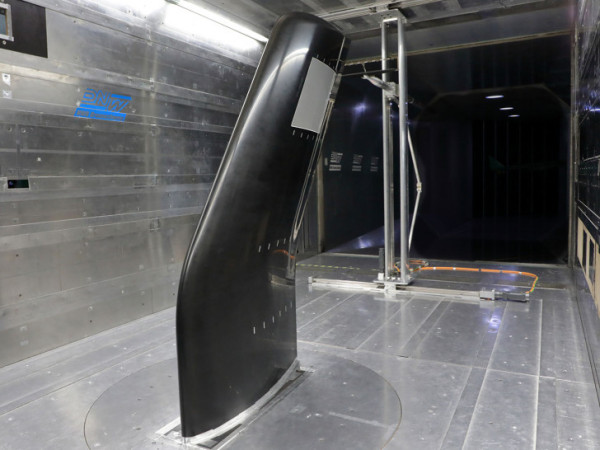 The sickle wing in the measurement section of the low-speed wind tunnel in Braunschweig. The 3D-printed suction panel was installed in the upper third of the wing and can be seen in grey. Image credit: Hendrik Traub/Braunschweig Technical University